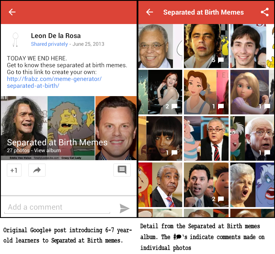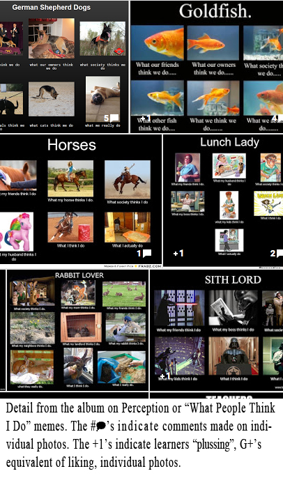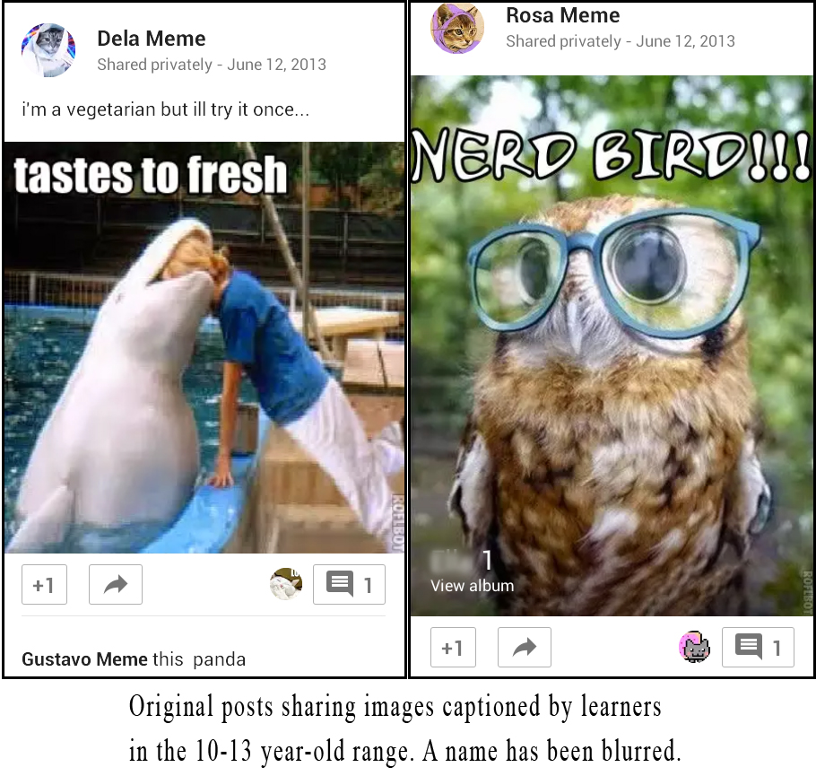 - Online: During Studio Meme, learners assumed control of one of five laptops each associated with a faux Google account as part of a private Google+ circle.